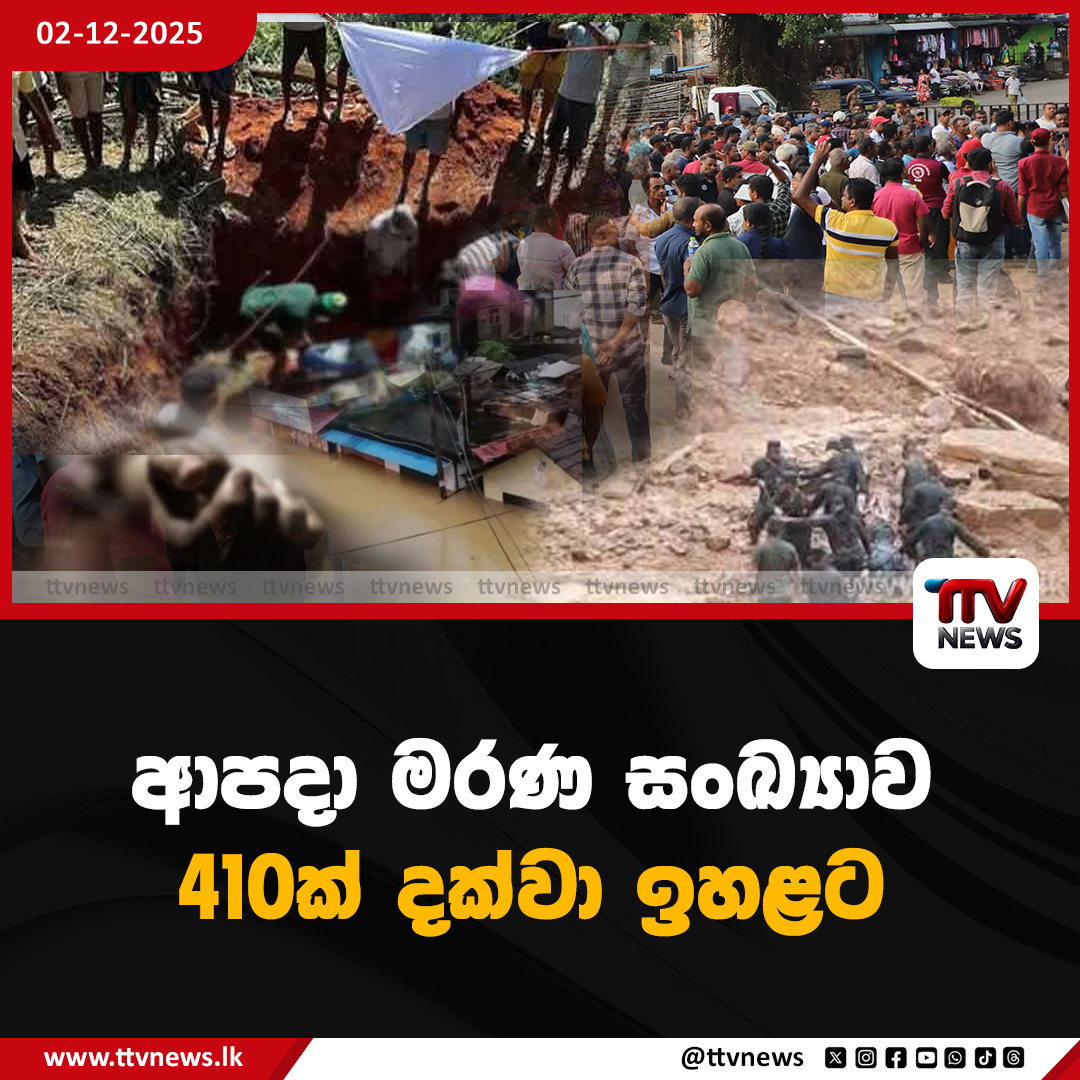 දිවයිනේ දිස්ත්රික්ක 25ටම බලපා ඇති ආපදා තත්ත්වය හේතුවෙන් සිදුවු ආපදා මරණ සංඛ්යාව 410ක් දක්වා ඉහළ ගොස් ඇතැයි ආපදා කළමණාකරණ මධ්යස්ථානය පවසනවා.