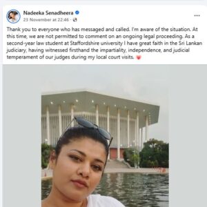 කෙසේ වෙතත් ඇයට වු අසාධාරණය හේතුවෙන් ඇයගේ අක්කා (නදීකා සේනාධීර) යන අය ෆේස්බුක් සටහනක්ද තබා තිබෙනවා.