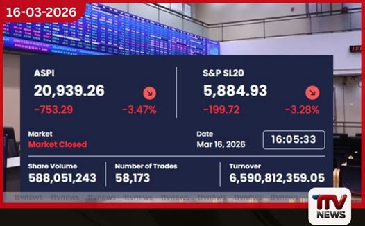 කොළඹ කොටස් වෙළඳපොළේ ප්රධාන දර්ශක දෙකම අද (2026 මාර්තු 16) දැවැන්ත පසුබෑමකට ලක් වූ අතර සියලු කොටස් මිල දර්ශකය (ASPI) ඒකක 21,000 සීමාවෙන් පහළට ඇද වැටුණි. දිනය අවසානයේ සියලු කොටස් මිල දර්ශකය ඒකක 20,939.26ක් ලෙස සටහන් වූ අතර සියලු කොටස් මිල දර්ශකය මෙලෙස ඒකක 21,000 මට්ටමෙන් පහළට ඇද වැටුණු පළමු අවස්ථාව මෙය වන්නේ 2025 සැප්තැම්බර් 18 වැනිදායින් පසුවය.