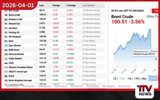 ශ්රී ලංකා වේලාවෙන් අද (අප්රේල් 1) මධ්යහ්නය වන විට ගෝලීය වෙළඳපොළේ බොරතෙල් මිල ගණන්වල සැලකිය යුතු පහළ යාමක් වාර්තා වී තිබෙනවා.