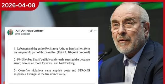 ඇමරිකාව සහ ඉරානය අතර පවතින සති දෙකක තාවකාලික සටන් විරාම ගිවිසුම, ලෙබනනය සහ සමස්ත “ප්රතිරෝධයේ අක්ෂය” (Resistance Axis) සඳහා ද අනිවාර්යයෙන්ම බලපැවැත්වෙන බව ඉරාන පාර්ලිමේන්තු කතානායක මොහොමඩ් බගර් ගලිබාෆ් (Mohammad Bagher Ghalibaf) අවධාරණය කරයි. ඉරානයේ කරුණු 10කින් යුත් සාම යෝජනාවට අනුව ලෙබනනය මෙම ගිවිසුමෙන් වෙන් කළ නොහැකි කොටසක් බව පවසන ඔහු, සටන් විරාම නීති උල්ලංඝනය කරන්නන්ට එරෙහිව දැඩි ප්රතිචාර දැක්වීමට පසුබට නොවන බවට ද අනතුරු අඟවා තිබේ.