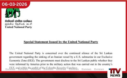 ශ්රී ලංකාවට අයත් සුවිශේෂී ආර්ථික කලාපය (EEZ) තුළ තවදුරටත් මිලිටරි ක්රියාමාර්ග නොගන්නා බවට ඇමෙරිකා එක්සත් ජනපදයෙන් සහතිකයක් ලබා ගැනීමට රජය වහාම පියවර ගත යුතු බව එක්සත් ජාතික පක්ෂය අවධාරණය කරයි. අද (06) නිවේදනයක් නිකුත් කරමින් එම පක්ෂය පෙන්වා දුන්නේ, ශ්රී ලංකා මුහුදු සීමාව ආසන්නයේදී ඇමෙරිකානු සබ්මැරීනයක් මගින් ඉරාන නෞකාවක් ගිල්වා දැමීම සම්බන්ධයෙන් රජය දිගින් දිගටම නිහඬව සිටීම කනස්සල්ලට කරුණක් බවයි.