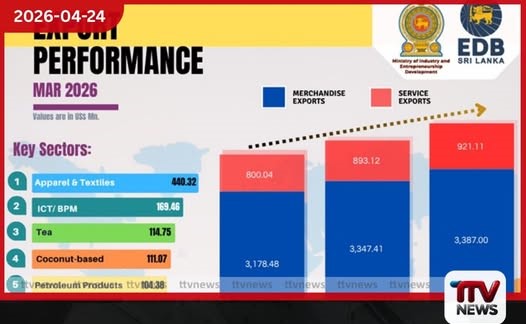 ශ්‍රී ලංකාවේ අපනයන සංවර්ධන මණ්ඩලය (EDB) නිකුත් කළ නවතම වාර්තාවලට අනුව, 2026 වසරේ පළමු කාර්තුව (ජනවාරි – මාර්තු) සඳහා මෙරට මුළු අපනයන ආදායම ඇමරිකානු ඩොලර් මිලියන 4,308.11ක් දක්වා ඉහළ ගොස් තිබේ. මෙය 2025 වසරේ අදාළ කාලසීමාවට සාපේක්ෂව සියයට 1.59ක වර්ධනයකි. පසුගිය මාර්තු මාසයේදී අපනයන ආදායම සියයට 5.2ක සුළු පසුබෑමක් පෙන්නුම් කළද, සමස්තයක් ලෙස පළමු මාස තුන තුළ අපනයන අංශය ශක්තිමත් ස්ථාවරත්වයක් පෙන්නුම් කර ඇති බව අපනයන සංවර්ධන මණ්ඩලයේ සභාපති මංගල විජේසිංහ මහතා ප්‍රකාශ කළේය.