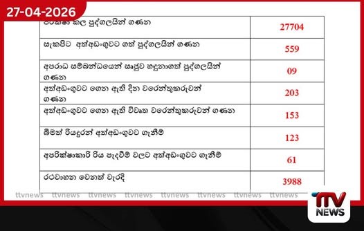 පොලිස්පතිතුමාගේ උපදෙස් මත දිවයින පුරා ක්‍රියාත්මක වන අපරාධ හා මත්ද්‍රව්‍ය නිවාරණ විශේෂ මෙහෙයුම් මගින් පසුගිය 24 පැය තුළ සැකකරුවන් පිරිසක් අත්අඩංගුවට ගත් බව පොලිස් මාධ්‍ය කොට්ඨාසය නිවේදනය කරයි. කොට්ඨාස මට්ටමින් සියලුම ප්‍රාදේශීය පොලිස් ස්ථාන ආවරණය වන පරිදි ක්‍රියාත්මක වූ මෙම මෙහෙයුම්වල 2026.04.26 වන දිනට අදාළ ප්‍රගතිය මෙසේය: